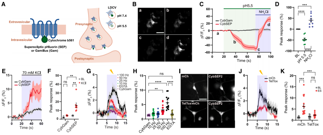 研究人员通过将SEP(Superecliptic pHluorin)锚定到LDCV特异性膜蛋白细胞色素b561 (Cyb561) 的腔侧,构建Cyb561 - SEP融合蛋白(CybSEP)。其中,SEP是GFP的pH敏感版本,它能够根据环境pH值的变化改变其荧光强度和光谱特征,它在pH 5时几乎完全淬灭,而在pH 7时绿色荧光强度提高约50倍。为了确定CybSEP是否响应pH变化而改变荧光,研究人员在PC12细胞中进行了实验,结果表明CybSEP在酸性条件下(pH 5.5)荧光几乎完全丧失,NH4Cl处理后信号恢复,而Cyb561 - GFP融合蛋白(CybGam)的荧光无变化。70mM KCl处理可使CybSEP荧光增强,且荧光变化与电刺激频率相关(10 -100Hz,100Hz时最强),EGTA处理可消除100Hz刺激引起的荧光,TetTox可抑制荧光变化。此外,通过将两个SEPs合并到Cyb561(CybSEP2)中,进一步修改CybSEP,其荧光变化幅度更大,响应电刺激的上升和衰减时间更快。