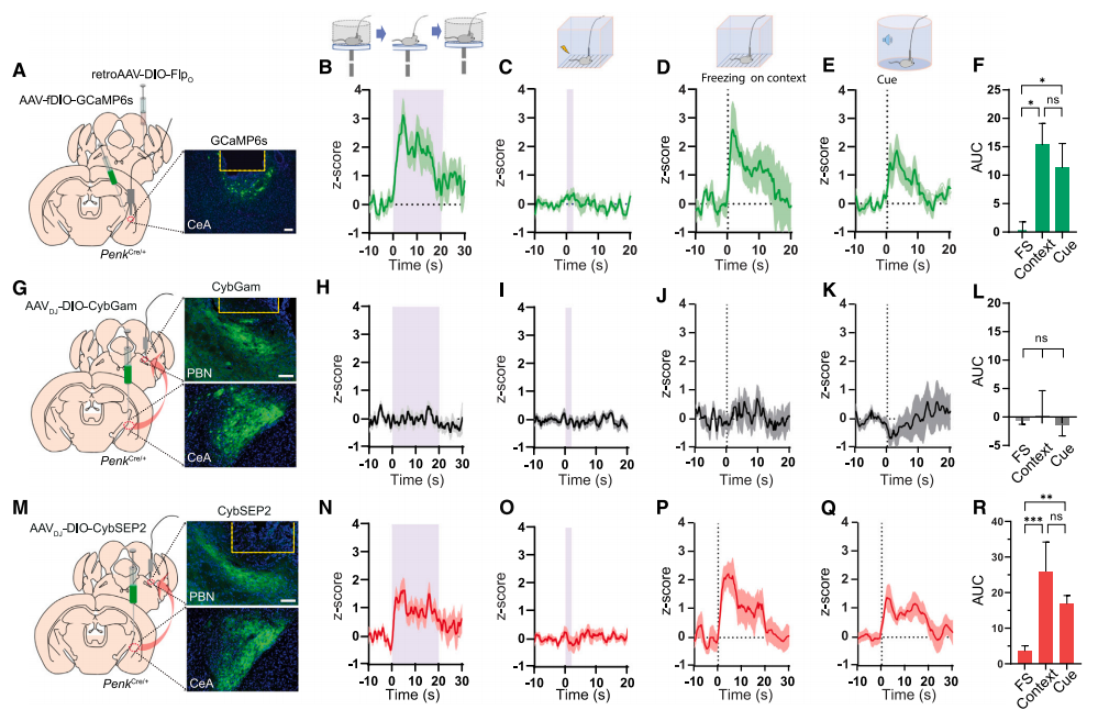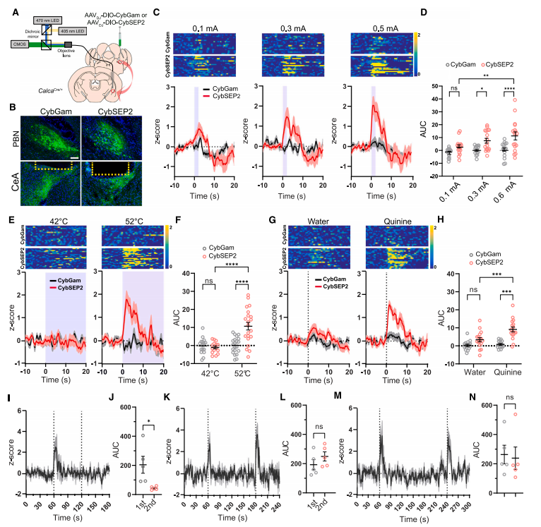 为了进一步检测在威胁条件反射情况下自由运动小鼠CGRPPBel→CeAl末端神经肽的释放,研究人员将AAVDJ-DIO-CybSEP2或AAVDJ-DIO-CybGam注射到CalcaCre/+小鼠的PBel中,然后在CeAl上植入光纤,借助CMOS光纤测光系统监测神经肽的释放。结果发现不同强度电刺激、52°C热刺激、奎宁刺激均可使CybSEP2表达小鼠CGRPPBel→CeAl末端荧光增加,而CybGam表达小鼠无荧光变化。