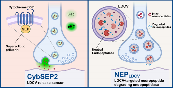 2024年7月22日,美国索尔克生物研究所的Sung Han研究组在Cell杂志在线发表题为"Presynaptic sensor and silencer of peptidergic transmission reveal neuropeptides as primary transmitters in pontine fear circuit"的研究论文,该研究创建了两种新型的基因编码工具LDCV传感器(CybSEP2)和LDCV沉默器(NEPLDCV),分别用于监测和抑制神经末梢神经肽的释放。