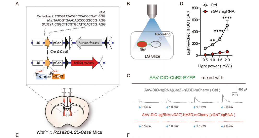 图2 基于CRISPR-Cas9 技术介导的vGAT和Nts敲低实验设计
