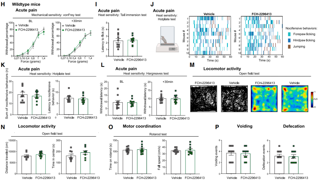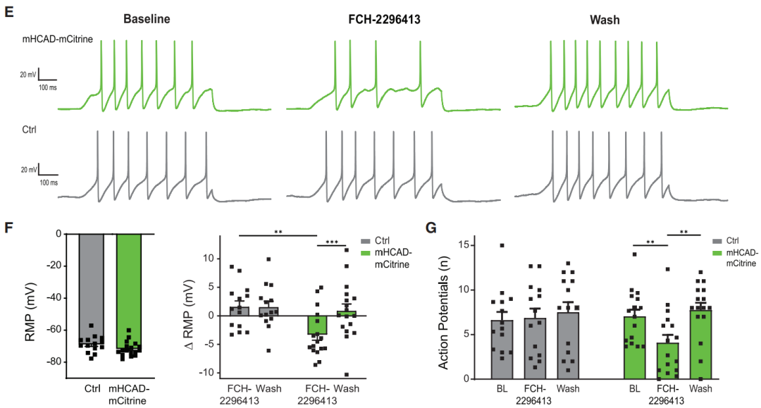 Gi信号的另一个典型效应是膜电位的超极化,这导致兴奋性降低和体感信息的编码。研究发现FCH-2296413显著降低了mHCAD-mCitrine+DRG神经元的静息膜电位(RMP)(图3E和3F),并减少了动作电位(APs)(图3E和3G)。这些影响是可逆的,因为在清洗FCH-2296413后,RMP和AP都恢复到基线水平(图3F和3G),并且在mHCAD-mcitrine阴性的对照神经元中没有出现这种现象(图3F和3G)。