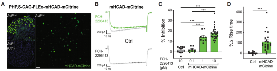 在细胞水平上使用全细胞膜片钳技术在分离的背根神经节(DRG)神经元中验证了mHCAD-mCitrine的功能。在DRG神经元中,Gi信号通常抑制电压门控钙通道(VGCCs),减少神经递质的释放以及从外周神经系统(PNS)到脊髓和大脑的体感信息(包括疼痛信息)的传递。在Avil-Cre小鼠的DRG神经元中,FCH-2296413以浓度依赖性的方式减少了HCAD-mCitrine阳性神经元中电压激活的钙电流幅度。在100 nm的浓度下,FCH-2296413没有产生任何抑制作用,1和10 μm的FCH-2296413显著抑制了VGCC(图2B和2C)。此外,在给FCH-2296413后钙电流动力学变慢(图2B和2D)。这些抑制作用与作用于DRG神经元内源性Gi-GPCRs的阿片类镇痛药产生的效果非常相似。在mHCAD-mCitrine阴性(对照)神经元中FCH-2296413对VGCCs没有抑制作用。