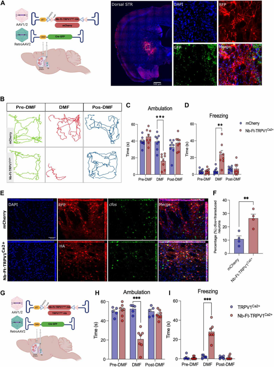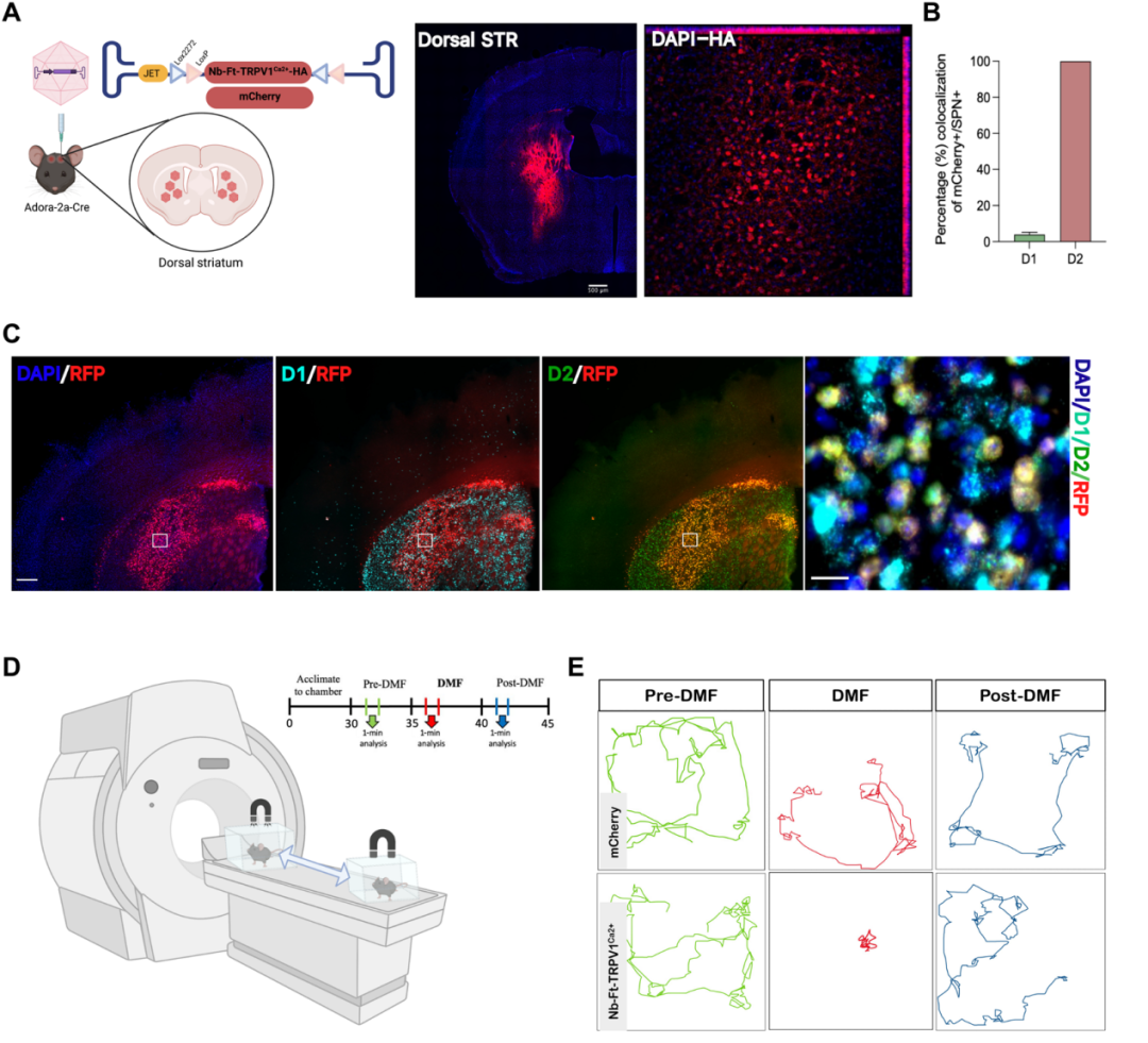 研究人员首先生成了针对内源性铁蛋白的纳米抗体,并将这些纳米抗体与TRPV1通道融合Nb-Ft-TRPV1Ca2+,以响应磁场的变化。通过AAV介导的方式将这些融合蛋白递送到小鼠的纹状体中,特别是D2型中等多棘神经元(iSPNs)。当这些小鼠被放置在磁场中时,观察到了明显的运动冻结行为,这表明磁遗传激活能够成功地在体内激活特定的神经元回路,并引起行为上的改变。