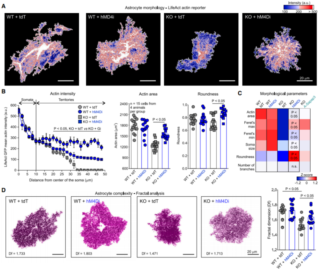由于Sapap3基因敲除小鼠中星形胶质细胞的形态减小,所以研究人员进一步探究星形胶质细胞hM4Di激活对星形胶质细胞的影响,通过体内注射AAV2/5 GfaABC1D LifeAct-GFP,使用LifeAct-GFP评估星形胶质细胞形态来观察肌动蛋白细胞骨架。LifeAct能够特异性地结合到肌动蛋白丝上,而不与单体肌动蛋白结合,LifeAct与GFP融合可以使其在活细胞中发出绿色荧光,使肌动蛋白丝在荧光显微镜下清晰可见。结果发现与 WT + tdT 相比,KO + tdT 星形胶质细胞中肌动蛋白细胞骨架标记强度在周边区域显著降低,而这种降低在 KO + hM4Di 星形胶质细胞中得到改善。因此,这说明星形胶质细胞Gi-GPCR信号通路的激活可以使Sapap3基因敲除小鼠的星形胶质细胞形态得到改善,这种改善是通过调节肌动蛋白细胞骨架实现的。