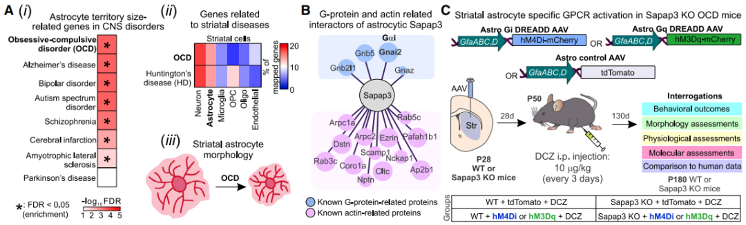 综上,激活纹状体星形胶质细胞中的 Gi - GPCR 通路可改善 Sapap3 KO 小鼠的焦虑和重复行为,恢复星形胶质细胞形态和稳态功能。这项研究不仅揭示了星形胶质细胞在强迫症中的潜在作用,还为开发新的治疗策略提供了理论基础。