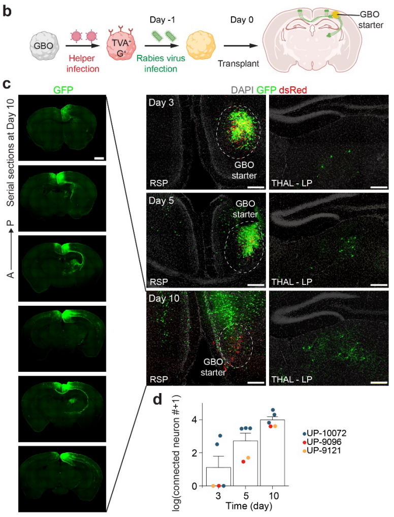 作者将来自三名患者的GBOs预先感染ΔG狂犬病毒,然后移植到成年免疫缺陷小鼠大脑的后内侧皮质(RSP)中(图1b)。观察到从移植后第3天开始,局部(同侧皮质、海马)和远距离(同侧丘脑、对侧皮质、基底前脑)投射的神经元中出现了GFP表达,并且到移植后第10天时,在来自三名患者的GBOs中,大约有10³ - 10⁴个神经元被广泛标记(图1c-d)。由于狂犬病毒至少需要2天时间进行复制、逆向跨突触传播并充分标记细胞,因此早在移植后第3天就检测到GFP⁺神经元,这表明胶质母细胞瘤(GBM)细胞在体内与神经环路整合的速度极为迅速。