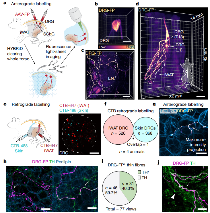 为了探究脂肪组织中的DRG投射,研究人员将一种表达荧光蛋白的AAV(AAV-FG)注射到胸腰段DRGs,借助HYBRiD组织透明化技术和光片显微成像技术,直接观察DRG神经元到脂肪组织的完整轴突投射,结果在腹股沟白色脂肪组织(iWAT)中发现大量的FG阳性纤维(图1a-d)。由于iWAT毗邻皮肤,研究人员接下来检测支配iWAT与皮肤的DRG是否相同,通过双色霍乱毒素亚基B(CTB)逆行示踪标记,发现支配iWAT与皮肤的DRG完全不共标(图1e-f),这些结果进一步证明DRG神经元直接支配脂肪组织(DRG→iWAT)。