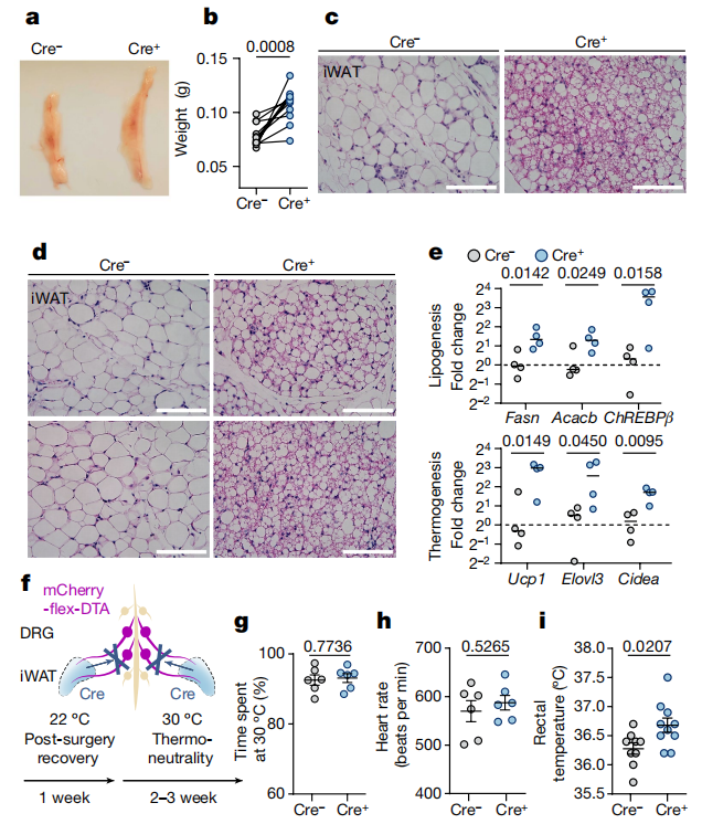 最后,研究人员探究感觉神经消融诱导的基因变化如何影响脂肪组织功能,观察发现与Cre-(对照侧)相比,Cre+(敲除侧)的iWAT中脂肪质量显著增加,激素敏感脂肪酶(HSL)磷酸化水平升高,米色脂肪细胞富集,产热作用相关基因转录水平显著上调(图4a-e)。进一步消融双侧iWAT中的感觉神经支配,将小鼠饲养于热中和(30 ℃)环境以排除其它热调节机制的影响,发现小鼠表现出核心体温升高,而小鼠体重、食物摄入量、温度敏感性及全身交感神经张力均无显著变化(图4f-i)。