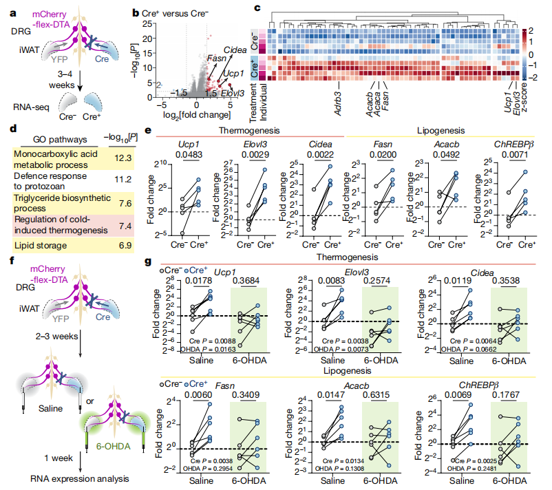 接下来,研究人员在DRG双侧注射mCherry-flex-DTA,在iWAT单侧注射表达Cre或YFP的ROOT,病毒表达3-4周后,对同一只动物的Cre+(敲除侧)和Cre-(对照侧)的脂肪组织进行RNA测序(RNA-seq)分析。结果发现感觉神经元的特异性缺失导致脂肪组织中脂肪生成和产热相关基因表达显著上调,包括Ucp1、Elovl3、Cidea等(图3a-e)。