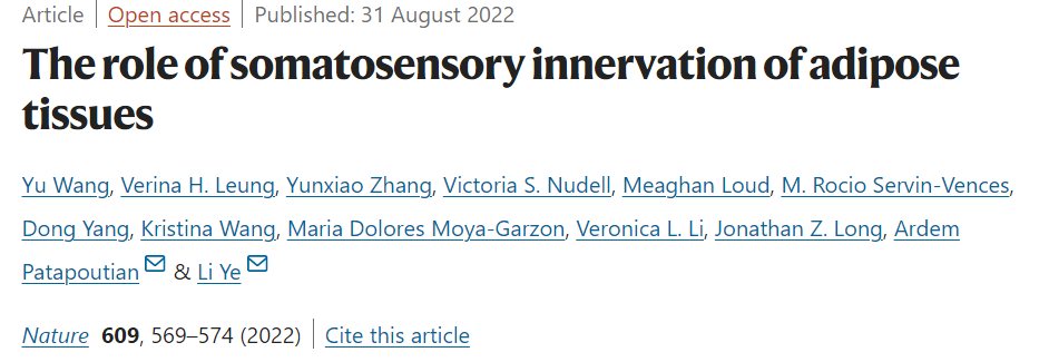 Wang Y, Leung VH, Zhang Y, Nudell VS, Loud M, Servin-Vences MR, Yang D, Wang K, Moya-Garzon MD, Li VL, Long JZ, Patapoutian A, Ye L. The role of somatosensory innervation of adipose tissues. Nature. 2022 Sep;609(7927):569-574. doi: 10.1038/s41586-022-05137-7. Epub 2022 Aug 31. PMID: 36045288; PMCID: PMC9477745.