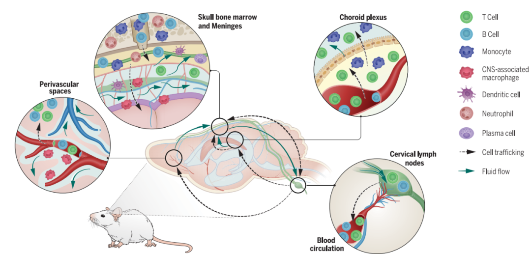 图5大脑免疫的新认知。此图展示了一个能够实现精细调节的大脑免疫监测的通讯网络。免疫细胞战略性地分布于免疫微环境中,在这些微环境里,它们持续接触由颅内间质液、脑脊液和淋巴液运输的中枢神经系统信号。一旦感知到大脑信号,免疫细胞便能够向中枢神经系统迁移,以发挥它们的效应功能。