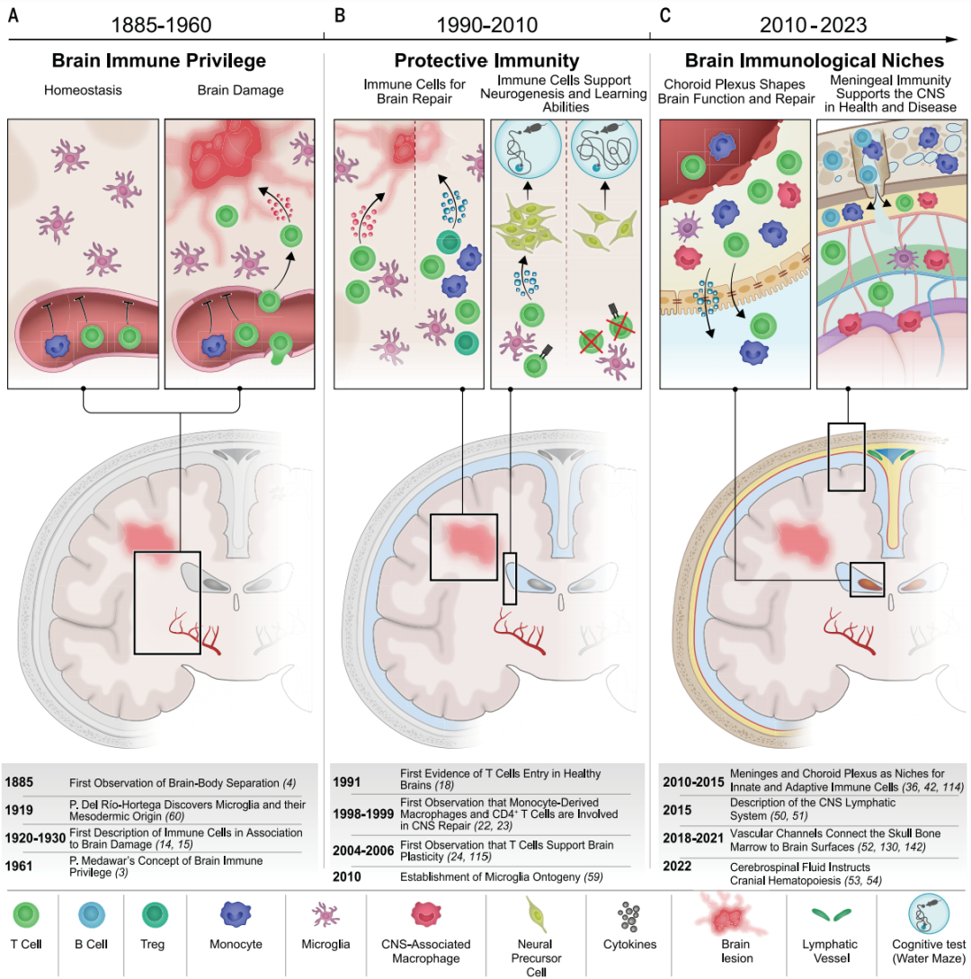 图1描绘大脑免疫新认知主要里程碑的时间轴。改变人们对大脑免疫理解的主要进展分为三个时期。(A)20世纪上半叶的发现支持了大脑“免疫豁免”的概念。根据这一观点,免疫细胞的浸润总是与中枢神经系统炎症和疾病状态相关。(B)20世纪末开始的早期发现将免疫反应在中枢神经系统维持和修复中的作用进行了阐释,随后还发现免疫细胞会影响神经发生和认知。(C)确定了大脑内不同的免疫微环境,固有免疫细胞和适应性免疫细胞可从这些微环境调节大脑功能和修复过程。