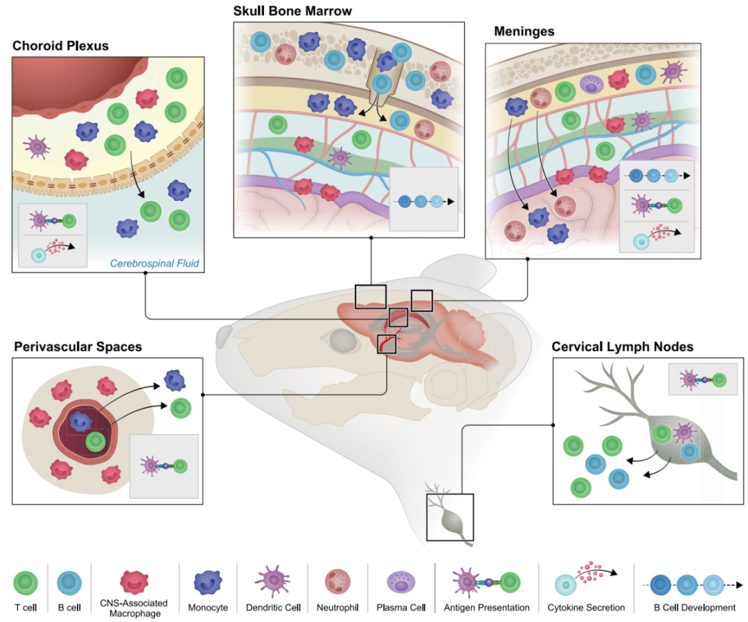 图3大脑边界以及连接外周与大脑的路径。该图展示了小鼠大脑内部及附近免疫细胞的分布情况,说明了在稳态下归巢到不同免疫微环境的细胞类型,这些免疫微环境包括血管周围间隙、脉络丛、颅骨骨髓、脑膜以及引流的颈淋巴结。图中还展示了在健康和疾病状态下,这些部位所发生的免疫过程:抗原呈递、细胞因子分泌和B细胞发育。箭头表示在各种病理条件下已被证实的、连接这些免疫微环境与大脑的主要路径。