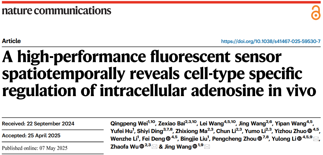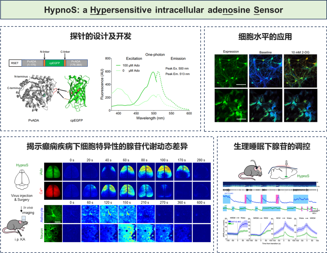 2025年5月7日,北京大学药学院王晶课题组联合中国科学院遗传与发育生物学研究所武照伐课题组和北京大学生命科学学院李毓龙课题组,在Nature Communications杂志发表题为“A high-performance fluorescent sensor spatiotemporally reveals cell-type specific regulation of intracellular adenosine in vivo”的文章,该研究成功开发了首个用于活体检测胞内腺苷的基因编码荧光探针HypnoS(Hypersensitive intracellular adenosine Sensor),并借助活体成像与光遗传技术等手段,探究了活体动物中胞内腺苷时空动态上的细胞特异性调控,以及背后的分子调控机制(图1)。
