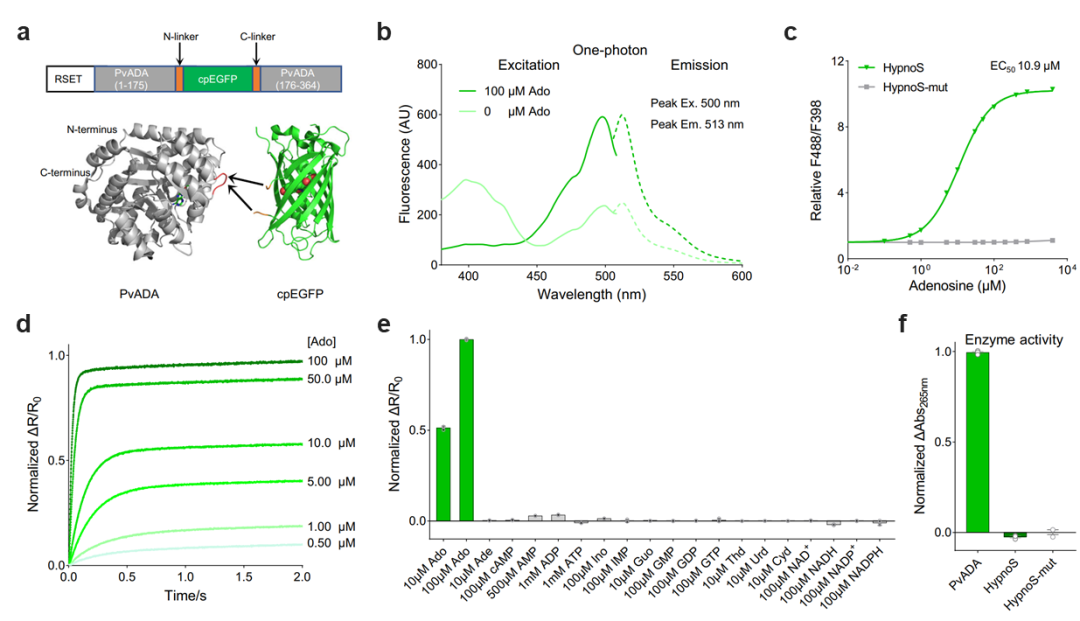研究团队基于循环重排绿色荧光蛋白(cpEGFP)与腺苷脱氨酶(PvADA),在筛选了超过3000个突变体后,成功构建了新型荧光探针HypnoS(取名古希腊神话中的“睡神”)。HypnoS具备极高的灵敏度(响应幅度>900%)、适宜的亲和力(EC50 ~11 μM)、亚秒级动力学特性及良好的选择性(图2),重要的是HypnoS表达对神经元的正常生理过程无明显影响,这些特性使其成为检测生理和病理条件下胞内腺苷变化的理想工具。