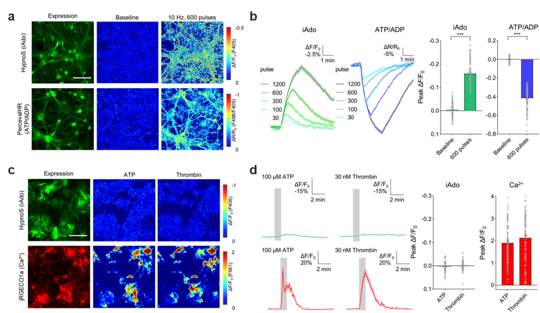 图3. 检测原代培养的神经元与星形胶质细胞中腺苷及ATP代谢差异。a和b. 神经元活动过程中腺苷代谢和ATP能量代谢之间的关系;c和d. 星形胶质细胞钙活动时胞内腺苷的动态变化。