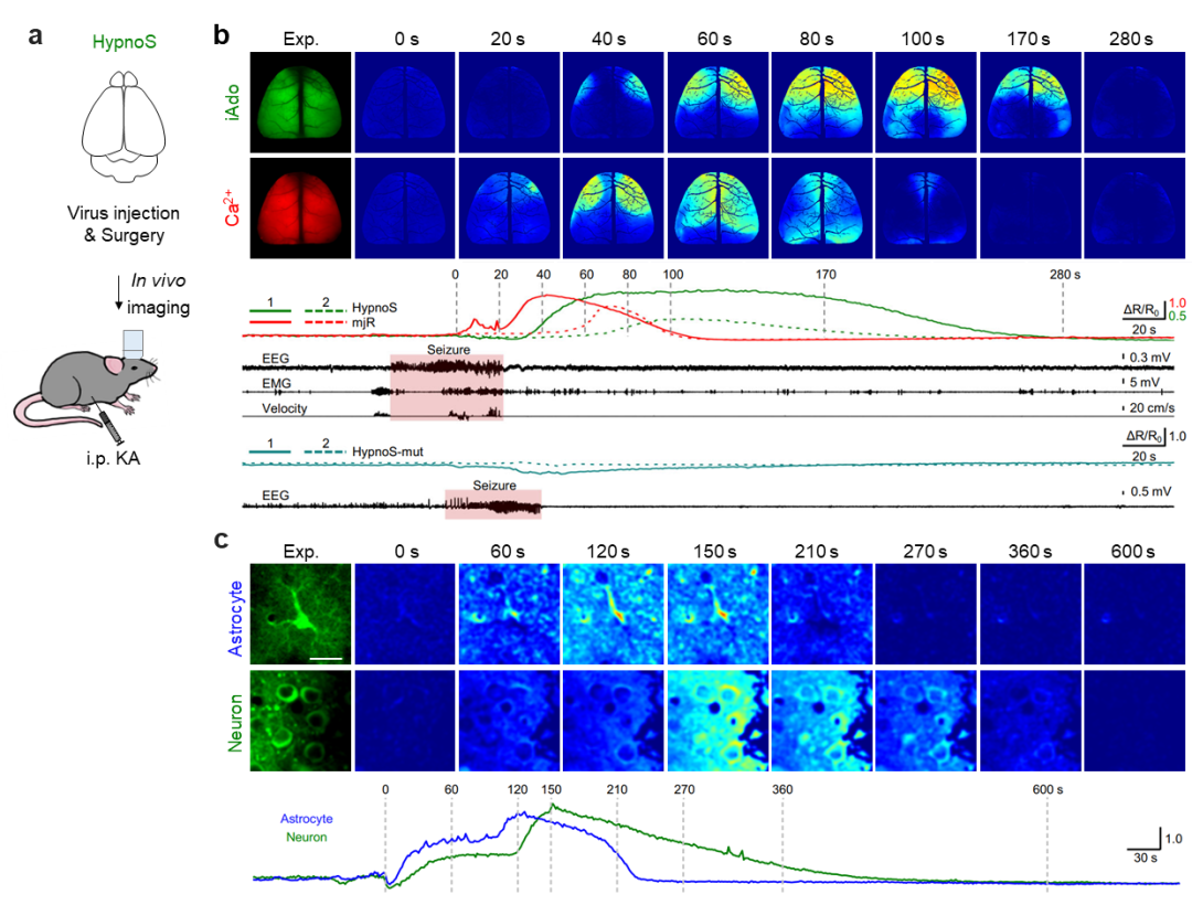 图4. 利用HypnoS检测癫痫发作过程中胞内腺苷的动态变化。a. 示意图;b. 结合大视场成像检测小鼠癫痫发作过程HypnoS与钙信号之间的时空关系;c. 结合在体双光子检测小鼠癫痫发作过程中神经元与星形胶质细胞胞内腺苷动态差异。