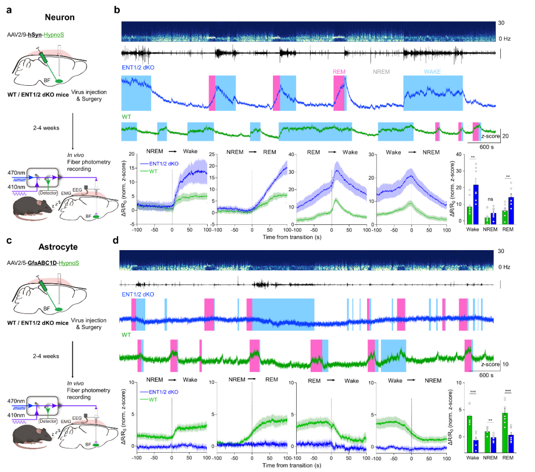 图5. 睡眠-觉醒周期中胞内腺苷的动态及细胞特异性调控。a和b. 睡眠-觉醒周期中ENT1/2 介导的腺苷转运在神经元中的作用。c和d. 睡眠-觉醒周期中ENT1/2 介导的腺苷转运在星形胶质细胞中的作用。
