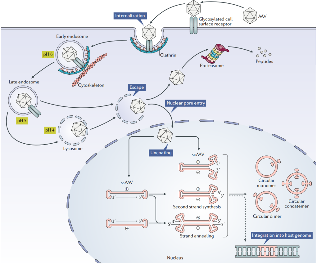 rAAV转导过程:rAAV通过与细胞表面受体结合,经网格蛋白介导的内吞作用进入细胞,在细胞内经历一系列pH依赖的结构变化,通过细胞骨架网络运输,经核孔进入细胞核。此时,释放的单链基因组必须转化为双链才能进行转录,这一转化过程可通过第二链合成或链退火两种方式实现,之后基因组可环化形成游离 DNA,实现基因表达。