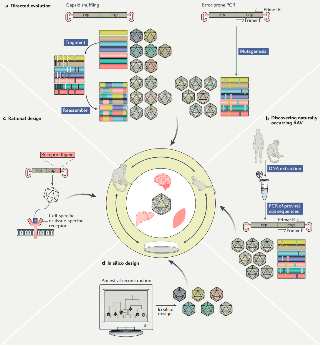 衣壳开发策略:为获得新特性,研究人员采用多种方法开发新型衣壳,包括自然发现(如从人类肝脏组织分离出AAV9,可跨越血脑屏障)、理性设计(如对AAV2进行改造,改变其靶向性和免疫原性)、定向进化(如CREATE方法筛选出可跨越血脑屏障的AAV-PHP.B)和计算机设计(如预测出Anc80,在多种组织有良好疗效)。