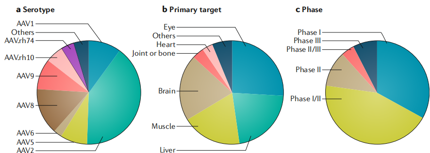 临床应用现状:截至2018年11月13日,已有145项涉及rAAV的干预性临床试验在ClinicalTrials.gov注册。AAV1(Glybera)和AAV2(Luxturna)已获监管批准用于商业用途,目前临床试验中常用的衣壳血清型包括AAV2、AAV8、AAV9等。
