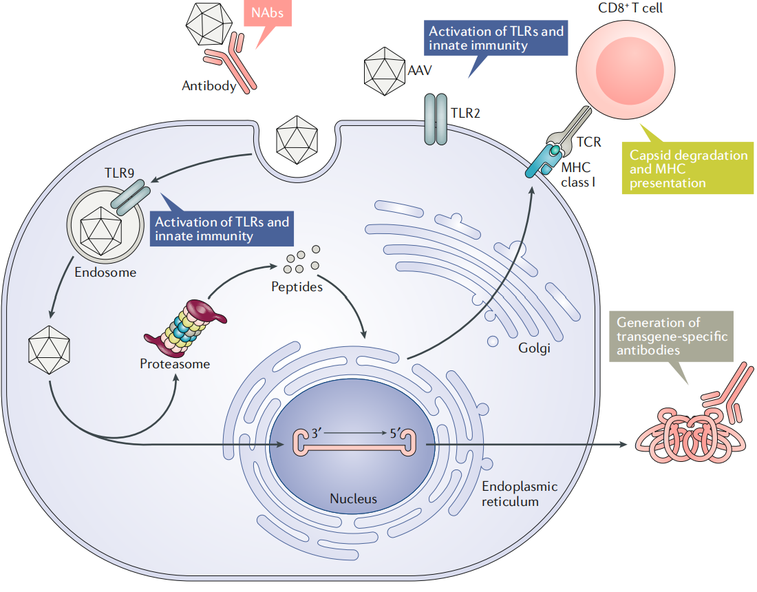 免疫相关障碍:人体中存在针对AAV衣壳的中和抗体(NAbs),它们会阻碍基因递送,AAV给药后还会引发体液免疫和细胞免疫反应,影响治疗效果。此外,AAV载体还会激活先天免疫,需要采取策略降低免疫反应。