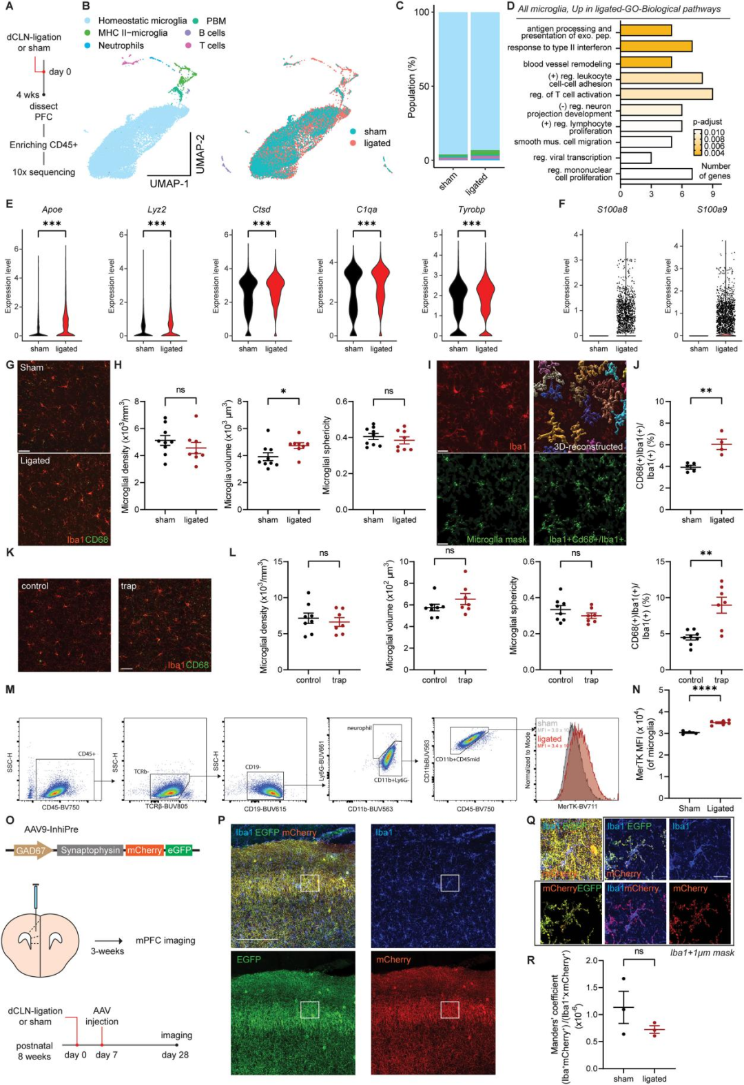 为探究功能异常的脑膜淋巴管对小胶质细胞的影响,研究人员对假手术组和dCLN结扎组小鼠的前额叶皮层(PFC)中分选出CD45+细胞,进行单细胞测序(图4A-4D),结果显示,dCLN结扎组小胶质细胞中与吞噬功能、疾病相关小胶质细胞特征相关的基因表达上调,且损伤相关分子表达增加(图4F)。dCLN结扎后单个小胶质细胞的体积增加了约20%,但小胶质细胞密度和形态复杂性并未改变(图4G-4H),小胶质细胞溶酶体体积增加了约50%(图4I-4L)。此外,作为关键吞噬作用受体的Mer原癌基因酪氨酸激酶(MerTK)在dCLN结扎小鼠的小胶质细胞中的表达也显著增加(图4M-4N)。这些结果表明,小胶质细胞会响应功能异常的脑膜淋巴管而改变其转录组、形态和功能。
