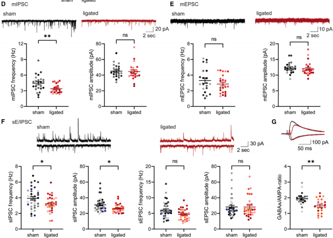 已有研究表明脑膜淋巴管功能障碍会导致行为异常;然而,淋巴管功能障碍与行为变化之间的神经机制仍不清楚。由于内侧前额叶皮层(mPFC)参与决策和认知过程,对II/III层锥体神经元进行电生理学实验,结果发现与对照组相比,dCLN结扎小鼠的微小抑制性突触后电流(mIPSCs)频率降低了约20%,但幅度没有变化(图2D)。mIPSC频率的下降在结扎后3周显现出来。结扎4周后,在海马CA1突触中也观察到了类似的变化。相比之下,兴奋性突触相关参数,包括微小兴奋性突触后电流(mEPSC)的频率和幅度均保持不变(图2E)。蛋白质分析显示抑制性突触后gephyrin和抑制性突触前成分VGAT分别减少了约20%。兴奋性突触分子如PSD-95和vGlut1的水平没有变化。dCLN结扎小鼠单个神经元的自发抑制性突触后电流(sIPSC)频率和幅度均下降(图2F),此外,自发兴奋性突触后电流(sEPSC)频率也有下降趋势。这一结果表明,观察到的mIPSC频率降低确实会影响正常生理情况,且无法通过体内平衡机制得到补偿。为了证实这一点,研究人员比较了同一神经元在相同刺激后抑制性突触反应与配对兴奋性突触反应。电刺激I层轴突纤维,同时将膜电位分别保持在-70 mV或0 mV,以测量兴奋性或抑制性突触反应。与之前的实验一致,dCLN结扎小鼠神经元中诱发的IPSC/EPSC比值比假手术对照组降低了约20%(图2G)。