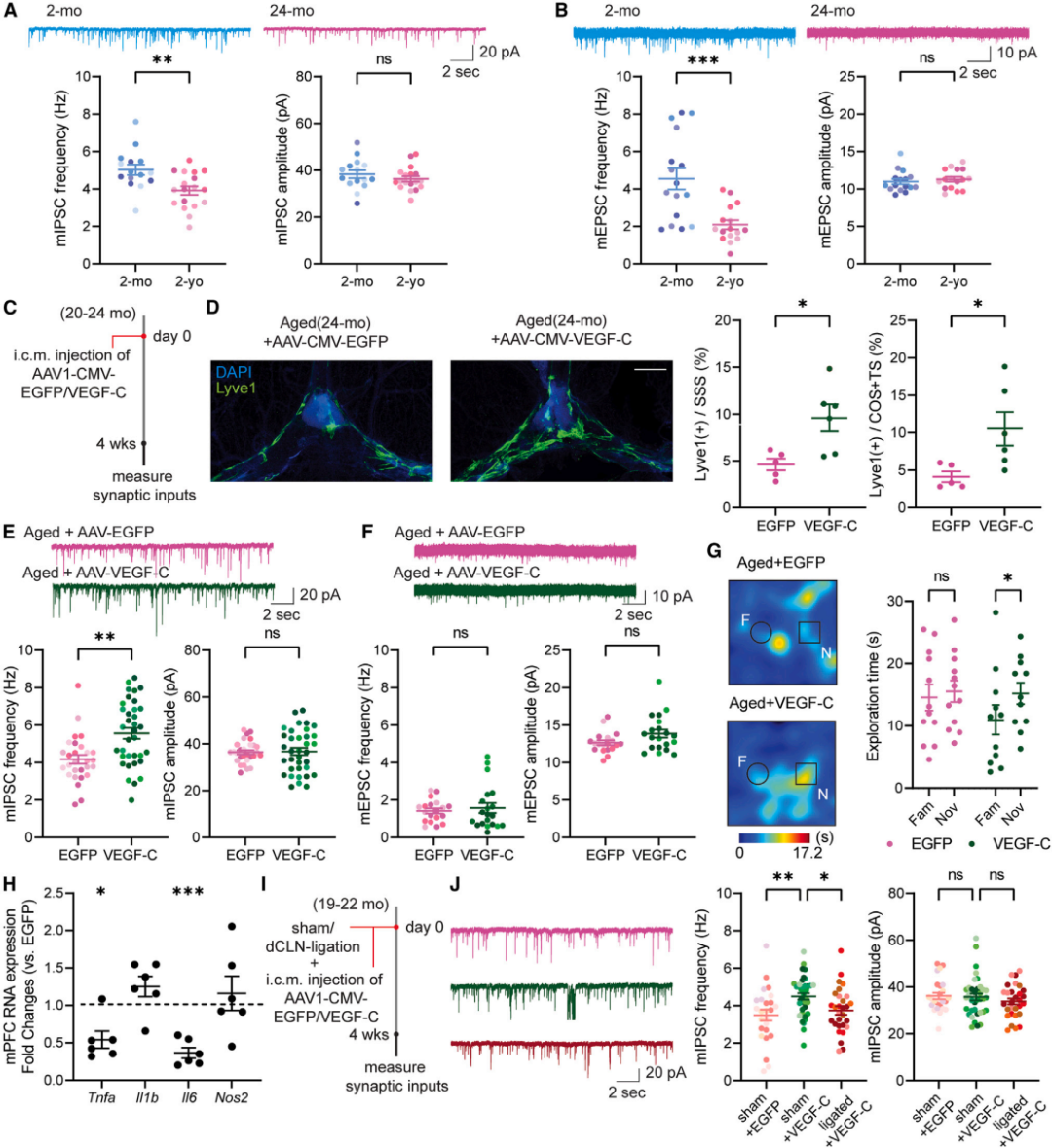 对比20-24月龄的老年小鼠和2月龄的年轻小鼠,发现老年小鼠mPFC层 II/III锥体神经元的mIPSC和mEPSC频率分别下降22%和46%,但幅度不受影响(图7A-7B)。向老年小鼠脑池内注射AAV1-CMV-mVEGF-C过表达血管内皮生长因子C,可增强脑膜淋巴管的覆盖范围和功能,增加 Lyve1(淋巴管标记物) 阳性区域覆盖(图7C-7D)。与注射 EGFP 的对照组相比,VEGF-C 处理能恢复老年小鼠 mPFC中降低的mIPSC频率(图7E),mEPSC频率和幅度不受影响(图7F),sE/IPSCs 的两个频率均增加。VEGF-C 处理的老年动物在新物体识别测试中的表现得到改善(图7G),同时 Il6水平降低(图7H)。将AAV1-CMV-mVEGF-C(或EGFP)脑池内注射与老年小鼠的假手术或 dCLN 结扎手术相结合(图7I),发现VEGF-C处理可使假手术组小鼠mIPSC频率增加(图7J),而dCLN结扎会消除VEGF-C的这种效果(图7J),表明VEGF-C对突触回路的影响是通过增强淋巴管功能介导的。