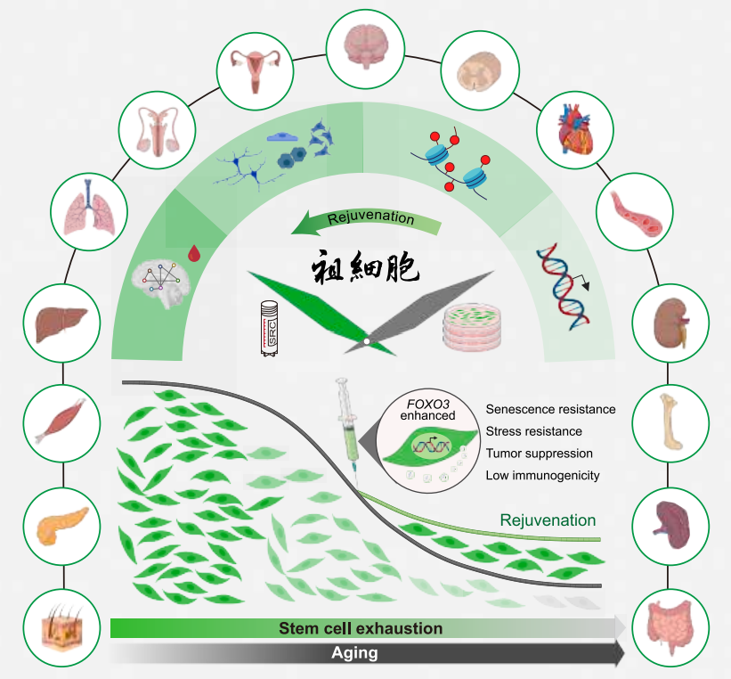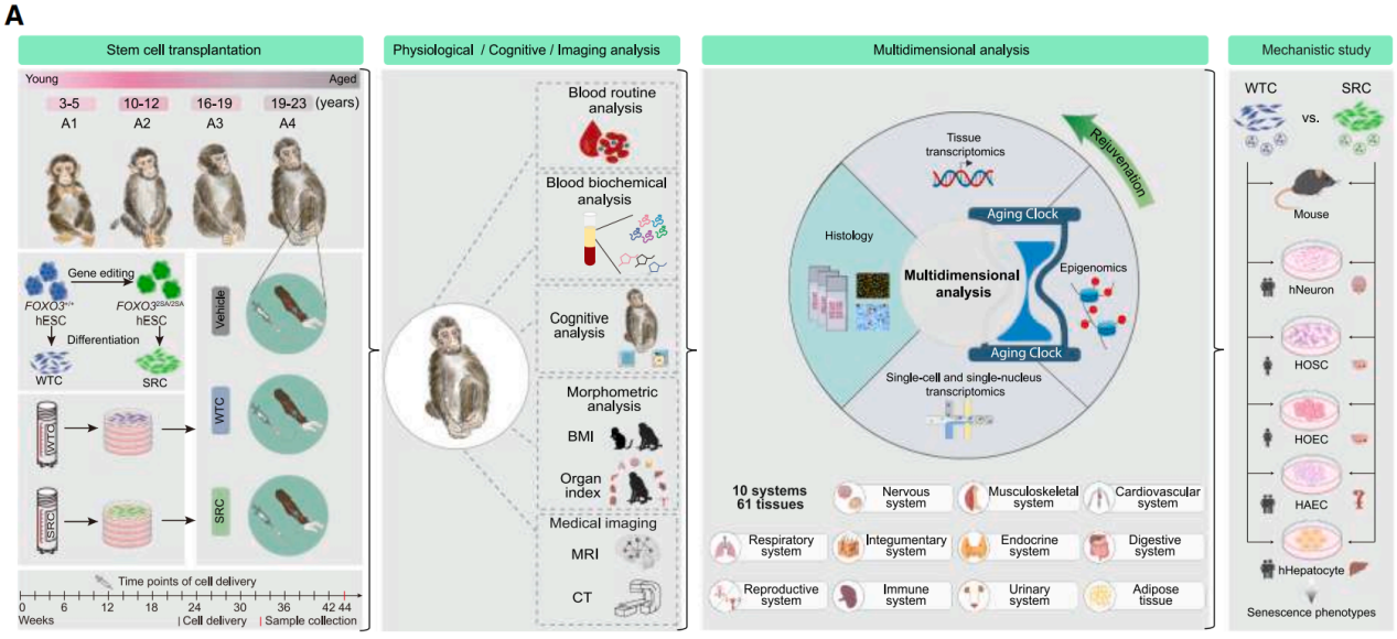 2025年9月4日,来自中国科学院动物研究所和首都医科大学宣武医院等单位的研究团队在国际顶刊Cell上发表了名为Senescence-resistant human mesenchymal progenitor cells counter aging in primates的文章,通过基因工程技术构建了FOXO3基因编辑的抗衰老人间充质祖细胞(SRCs),在为期44周的实验中,向老年食蟹猴静脉输注SRCs,结果显示其能显著降低衰老标志物(如细胞衰老、慢性炎症、组织退化),提升大脑结构与认知功能、改善生殖系统衰退及骨密度,且无明显不良反应;机制上,SRCs的抗衰效应部分依赖其分泌的外泌体(SRC-Exo),该研究为干细胞疗法对抗灵长类衰老提供了关键证据,凸显其作为抗衰再生疗法的潜力。