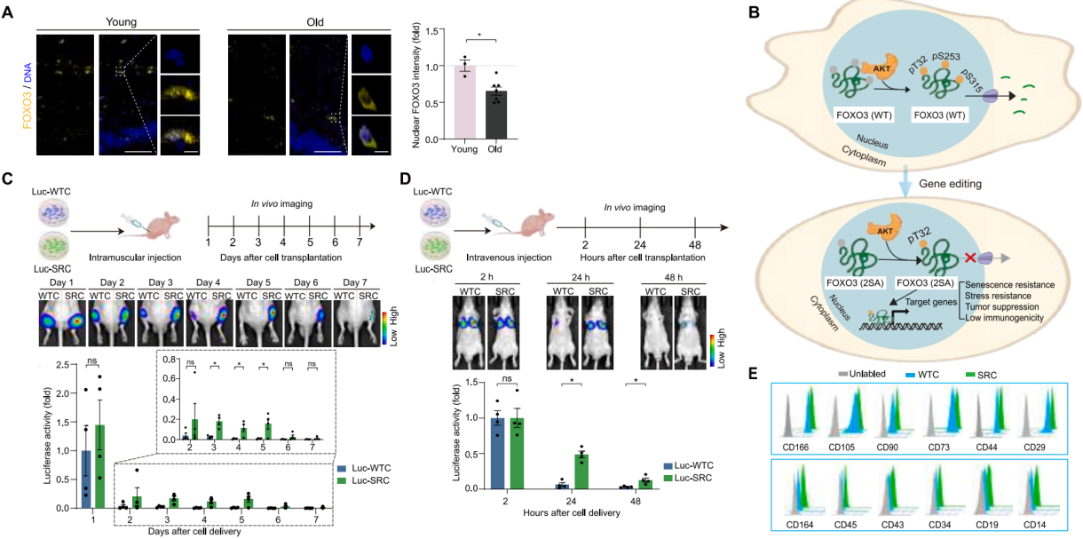 研究团队的首要任务,是打造出能抵御衰老环境的“升级版”干细胞。他们把目光锁定在FOXO3——这个基因是人类长寿的关键“开关”,活性降低会加速细胞衰老。通过基因编辑技术,团队对人胚胎干细胞(hESCs)的FOXO3基因进行了精准改造:将其2个容易被磷酸化失活的位点(Ser253、Ser315)替换成丙氨酸(命名为FOXO3 2SA/2SA hESCs),再将这些改造后的干细胞分化为间充质祖细胞,最终得到“抗衰祖细胞(SRCs)”。