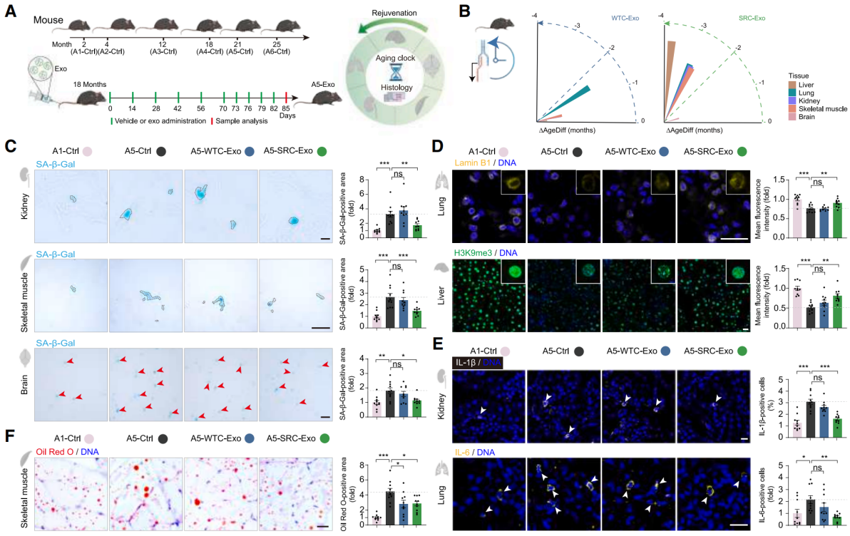 为了验证外泌体的作用,给18月龄的老年小鼠(对应人类56岁)输注SRC-Exo,12周后,小鼠的肝脏、肺、肾、骨骼肌的转录组年龄显著降低,衰老标志物减少;另外,用SRC-Exo体外处理人神经元、卵巢基质细胞、主动脉内皮细胞,这些细胞的衰老程度明显减轻,增殖能力提升。