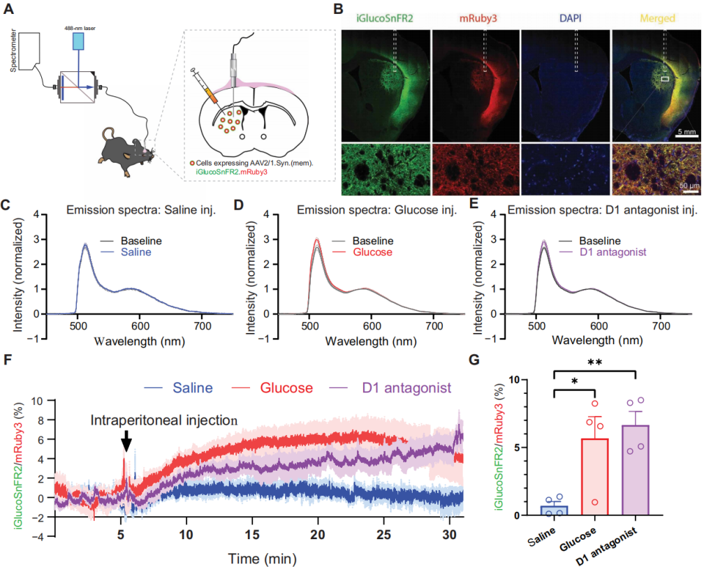 iGlucoSnFR1难以有效靶向哺乳动物细胞膜,而采用SFGFP及啮齿动物优化密码子的修饰,显著提升了mem-iGlucoSnFR2的膜定位效率(图1C),mem-iGlucoSnFR1则完全无法定位。神经元培养中,膜定位iGlucoSnFR2可即时响应胞外葡萄糖浓度变化,细胞质探针响应略慢。基于此,在小鼠背外侧纹状体神经元中表达mem-iGlucoSnFR2-mRuby3(图5A),免疫染色证实其定位于细胞膜(图5B),并通过光谱分辨光纤记录法进行体内检测,该技术可经光谱解混分析消除信号串扰与血红蛋白吸收干扰。自由活动小鼠实验中,探针对腹腔注射葡萄糖呈强烈荧光升高响应,对生理盐水无响应(图5C-G);注射多巴胺D1受体拮抗剂SCH23390后,神经元放电受抑制、葡萄糖利用减少,胞外葡萄糖积累被成功检测(图5E-G)。