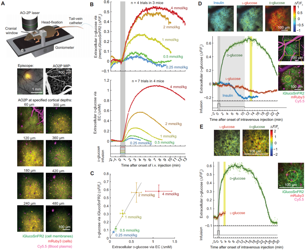 对清醒小鼠初级体感皮层sV1皮层I层进行AO2P成像,以1 Hz时间分辨率、亚微米空间分辨率绘制胞外葡萄糖空间分布图(图7D),按1分钟荧光强度权重计算像素∆F/F0,绘制胰岛素(2 IU/kg)、L-葡萄糖(8 mmol/kg)、D-葡萄糖(8 mmol/kg)处理后的分布及无血管重叠区域的时间动态曲线;对微小血管放大成像获更高分辨率(图7E)。两种尺度下,静脉注射葡萄糖在胞外均匀分布,探针荧光峰值晚于血糖峰值,表明脑内葡萄糖摄取受血脑屏障(BBB)转运速率限制。
