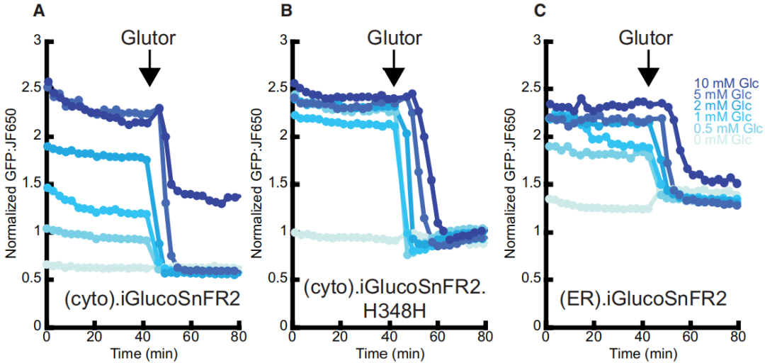 为了验证iGlucoSnFR2对细胞内葡萄糖浓度变化的监测能力,研究人员将细胞质靶向的该探针及对照(cpSFGFP-HaloTag)、iGlucoSnFR1-HaloTag质粒瞬时转染HeLa细胞(图2),通过将iGlucoSnFR2与信号稳定的标签(如mRuby3)融合,实现绿色探针信号相对于无响应红色/远红色信号的归一化(校正蛋白质表达量差异、成像焦点漂移等非分析物因素导致的荧光波动,确保信号变化仅反映分析物浓度变化),经JFX650孵育后用多孔成像仪观察,以含不同浓度葡萄糖的缓冲液平衡细胞后加入10 μM Glutor(抑制双向葡萄糖转运体GLUT-1/2/3)处理,结果显示iGlucoSnFR2因更高的∆F/F与亲和力,荧光下降幅度显著优于iGlucoSnFR1且在5 mM外部葡萄糖时饱和,该结果在HEK293、U2OS、COS-7细胞系中得到验证;同时构建的高亲和力变体iGlucoSnFR2.H348H(Kd≈3 μM)在葡萄糖耗尽后监测到细胞质葡萄糖缓慢回升(浓度3~500 μM),提示细胞内储存库的葡萄糖释放,灌流实验进一步验证了探针的快速响应与恢复能力;ER靶向的iGlucoSnFR2在1 mM外部葡萄糖时即饱和,表明ER葡萄糖浓度高于细胞质(图2C),Glutor处理后其浓度下降,提示葡萄糖可从ER流出。