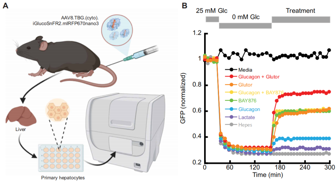 除了监测细胞质(及ER)葡萄糖耗竭外,iGlucoSnFR2可观察原代肝细胞(体内主要葡萄糖调节细胞)的糖异生(是指生物体利用丙酮酸、乳酸、甘油、生糖氨基酸等非糖物质,在肝脏(主要场所)和肾脏(次要场所)中合成葡萄糖或糖原的代谢途径)过程。将含肝脏特异性TBG启动子调控的cyto-iGlucoSnFR2-mIRFP670nano3的AAV8感染小鼠,提取肝脏后在多孔成像仪中观察肝细胞响应(图3)。肝细胞经2小时葡萄糖饥饿后,分别用“丙酮酸+乳酸(糖异生底物)”或“丙酮酸+胰高血糖素(直接刺激糖异生)”处理,均使iGlucoSnFR2荧光升高,且胰高血糖素效果更优。鉴于GLUT介导葡萄糖双向转运,探究BAY876(阻断GLUT-1)与Glutor(阻断GLUT-1/2/3)对胞质葡萄糖的影响,两种药物均提升胞质葡萄糖浓度,Glutor效果更显著(图3,红/橙色vs黄/绿色曲线);且仅在Glutor存在时,胰高血糖素可显著提高葡萄糖浓度(图5,红vs橙、黄vs绿曲线)。