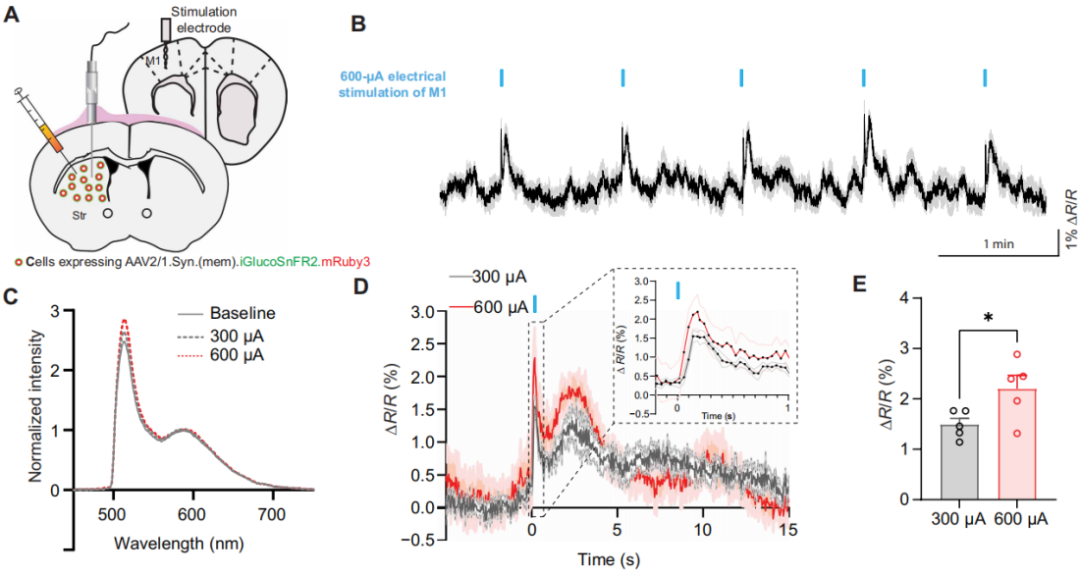 为了验证皮层内电刺激对胞外葡萄糖的影响,监测M1(向纹状体有谷氨酸能投射,图6A)电刺激后的纹状体动态,刺激引发胞外葡萄糖快速(~100ms内)瞬时升高,600 μA刺激响应显著强于300 μA且持续更久,自由活动动物中还观察到刺激后约1秒的二次升高(图6B-E)。这些结果证实,iGlucoSnFR2可通过神经血管耦合机制介导的刺激强度依赖性响应,监测脑内胞外葡萄糖动态,验证了其在活体实时代谢传感中的灵敏应用价值。
