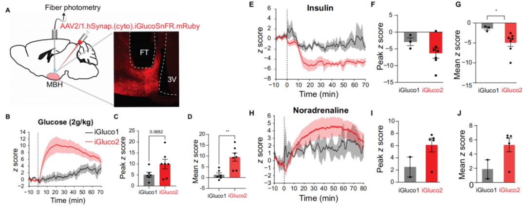 此前研究显示,iGlucoSnFR1可报告果蝇脑外植体及斑马鱼胚胎的胞内葡萄糖变化,但在哺乳动物体内的实用性未被证实。基于iGlucoSnFR2在细胞培养中的优异性,研究在小鼠下丘脑腹内侧区(MBH,调控能量平衡与葡萄糖稳态的关键脑区)对比两者性能(图4A),向下丘脑腹内侧区注射编码cyto-iGlucoSnFR2-mRuby3或cyto-iGlucoSnFR1-mRuby2的AAV,2-4周后以光纤记录监测荧光。结果表明,iGlucoSnFR1对腹腔注射葡萄糖(图4B-D)、胰岛素(图4E-G)的响应幅度温和且信号嘈杂;而iGlucoSnFR2响应强烈且信号清晰,还能监测去甲肾上腺素处理后的胞内葡萄糖变化(去甲肾上腺素通过刺激肝糖生成等升高血糖)。综上所述,iGlucoSnFR2比iGlucoSnFR1更灵敏可靠,可用于观察哺乳动物活体脑内胞质葡萄糖动态。