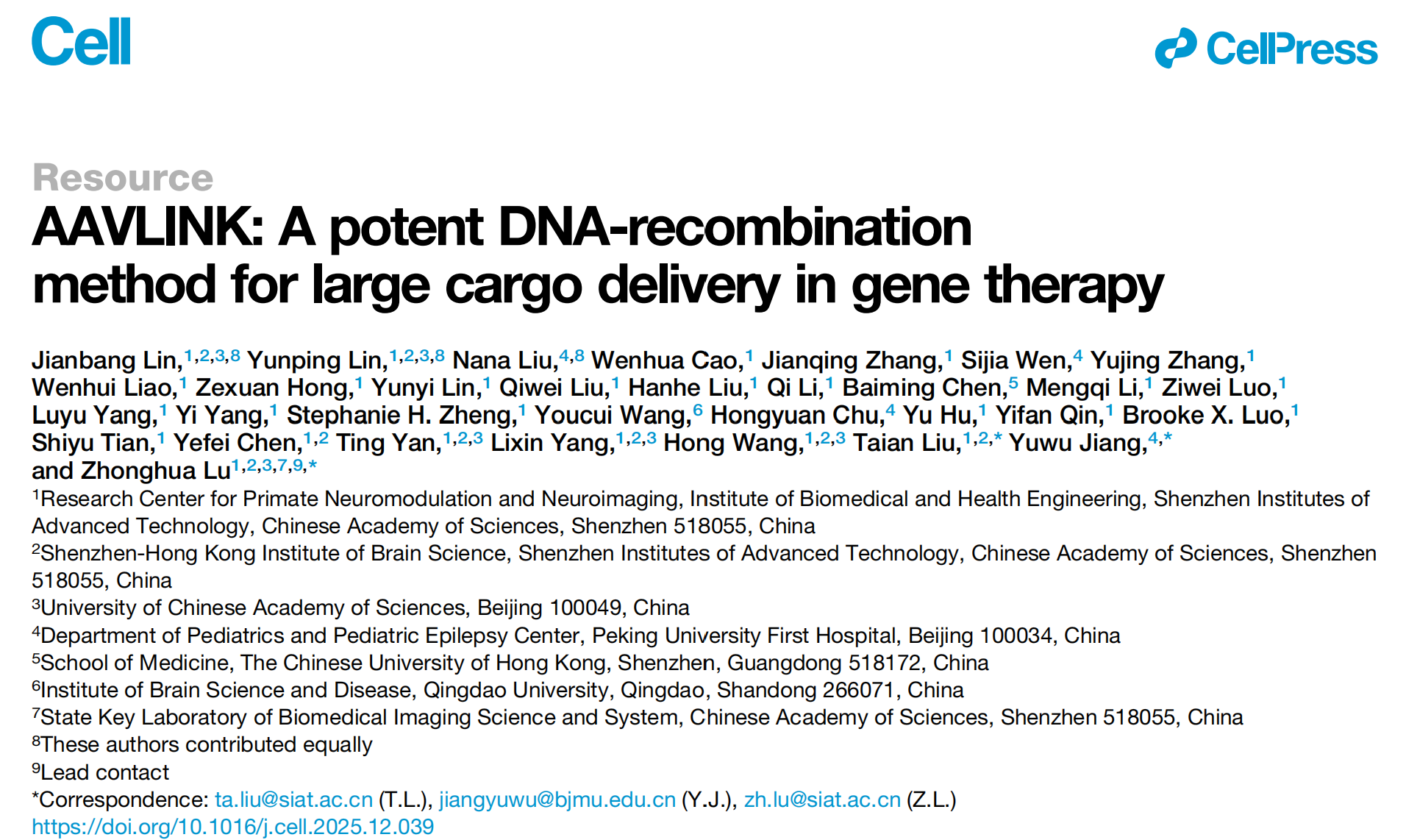 2026年2月5日,中国科学院深圳先进技术研究院路中华、刘太安团队与北京大学第一医院姜玉武团队合作在Cell上发表了最新研究:“AAVLINK: A potent DNA-recombination method for large cargo delivery in gene therapy”,开发了AAVLINK这一高效基因递送平台,通过Cre/lox介导的DNA重组技术,突破了AAV的包装容量限制(常规<5kb),可高效递送超长治疗基因(双载体系统可覆盖<6.2kb基因,三载体系统最高可达11kb)和CRISPR工具,且副产物少、安全性高;其升级版本AAVLINK2.0通过优化启动子和添加蛋白不稳定标签降低Cre表达,进一步提升生物安全性;该平台成功在小鼠模型中拯救了Phelan-McDermid综合征(Shank3基因)和Dravet综合征(SCN1A基因)的相关表型,还构建了包含193个疾病相关大基因和5个CRISPR工具的载体库(http://AAVLINK.com/),为大基因相关遗传病的基因治疗提供了强有力的技术支持和资源储备。