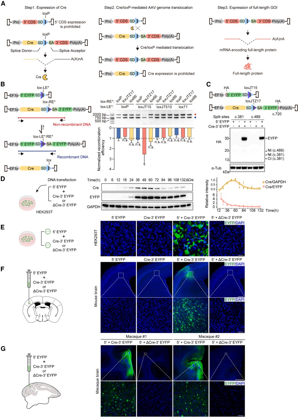 为了降低Cre介导易位的可逆性,采用左/右回文臂突变的不对称lox位点(LE/RE)。二者重组产生野生型loxP及双臂突变lox位点,后者无法作为Cre底物,使易位基本不可逆。通过电泳条带比值分析重组效率,证实loxJT15(LE)与loxJTZ17(RE)组合效果最优(图1B)。Sanger测序验证全长EYFP精准重组,此二者被用于AAVLINK设计。AAVLINK中,GOI 5'端mRNA含未剪切SD且无poly(A)信号,3'端作为Cre下游非翻译区转录,故截短蛋白极少,WB检测无截短EYFP(图1C)。时序分析显示EYFP 60小时达峰后稳定,Cre 60小时起显著下降至84小时基础水平(图1D),这是其两大核心优势。将拆分EYFP包装于双载体,仅共转染时培养细胞及小鼠皮层出现荧光,无Cre则无信号(图1E、1F)。食蟹猴大脑实验获类似结果,彰显转化潜力(图1G)。综上,AAVLINK可在体外体内高效精准重组拆分基因,且副产物少。