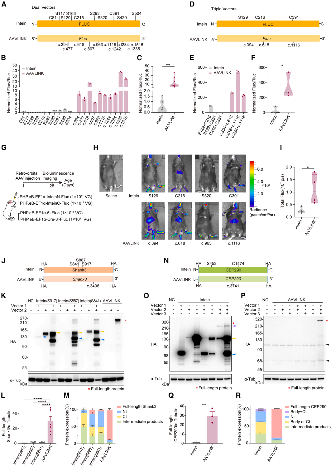 重组疾病相关大基因Shank3(5.4kb)和CEP290(7.4kb)时,SHANK3单倍体不足是费兰-麦克德米德综合征(PMS)的主要病因,三个拆分位点下(图3J),内含肽法重组微弱,AAVLINK效率为其36.6±22.1倍,且无截短产物(图3K-3M)。CEP290拆分为两段装入双AAVLINK载体,第三载体供Cre(图3N),其产量比内含肽法高29.8±4.4倍(图3O-3Q)。AAVLINK组全长CEP290占比83.4%±2.4%,内含肽组仅0.2%±0.1%(图3R),证实AAVLINK高效且副产物少。