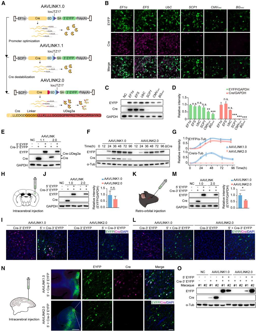 第二步:添加不稳定标签(AAVLINK2.0)在Cre的C端融合强效蛋白不稳定标签UDeg3a,使Cre几乎检测不到且不影响重组效率(图6E-6G),最终形成AAVLINK2.0(图6A)。
