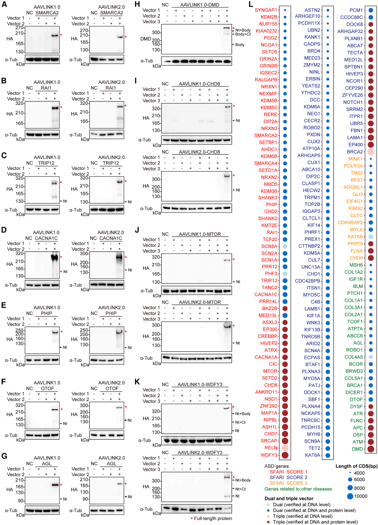 为了提升AAVLINK的实用性,作者构建了遗传病相关大型基因资源库,重点关注自闭症(ASD)风险基因——其遗传关联性强、缺乏有效疗法,单基因病例多为LoF突变(适合基因替代),且多数超过4kb,是理想递送候选。从SFARI数据库克隆了所有>4kb的基因,及27个其他疾病相关基因(如AGL、ATP7A、OTOF,其LoF突变分别致Ⅲ型糖原贮积病等),按基因长度拆分装入双/三载体AAVLINK,在细胞内验证DNA和蛋白水平重组效果。198个基因(193个疾病相关+5个CRISPR相关)先克隆至AAVLINK1.0,后改造为AAVLINK2.0以提升治疗适用性;Sanger测序证实所有基因均实现DNA重组,192个基因的全长蛋白表达经WB验证(图7)。多数基因经单一拆分即可重组,体现AAVLINK稳定性;但不同拆分方案效率有差异,与荧光素酶实验结果一致(图3A-3F),部分基因需筛选最优拆分位点以达最佳效果。资源库详细信息(基因名称、长度、验证状态)见图7L及表S1,同时搭建专门网站(http://AAVLINK.com/),便于研究者查阅。