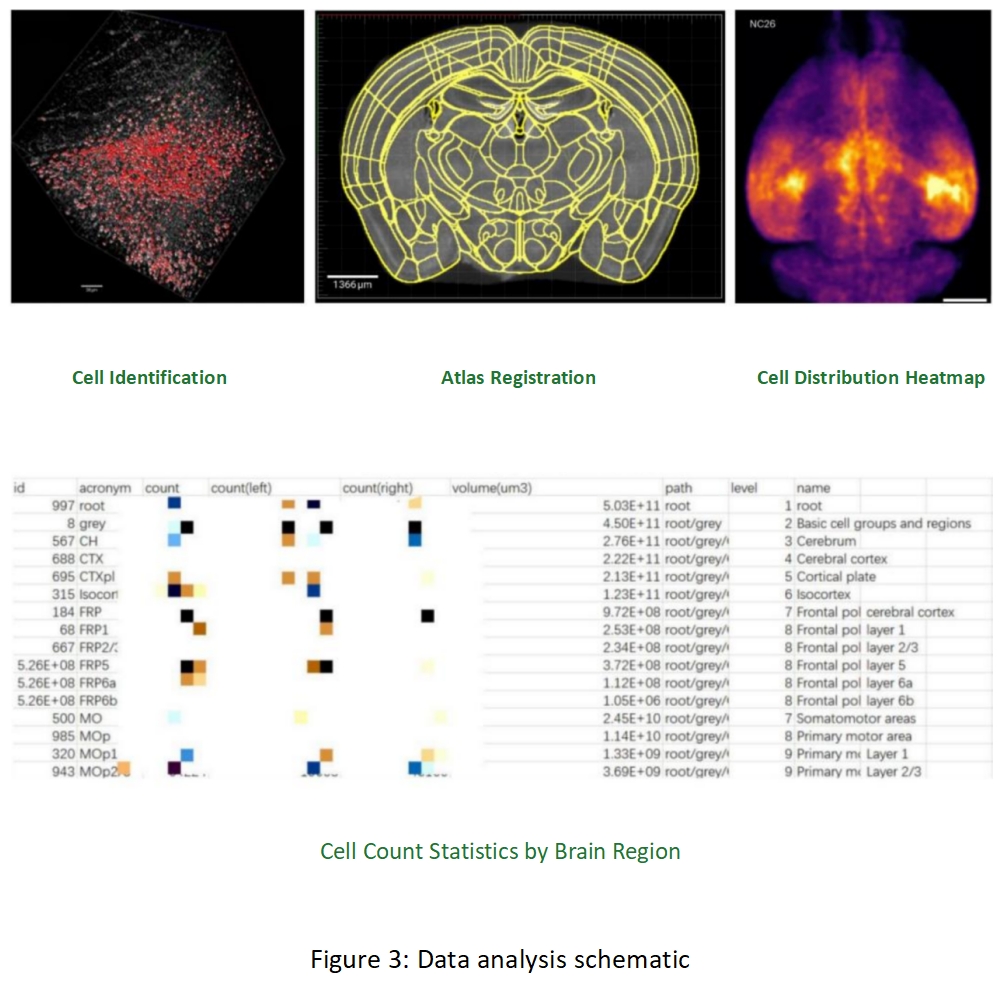 Includes whole-brain cell detection, image stitching & reconstruction, and registration to the Allen CCFv3 atlas, enabling precise 3D reconstruction and analysis of brain structures.