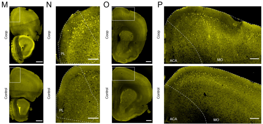 Using c-Fos immunostaining combined with VISoR whole-brain imaging, we precisely detected high c-Fos expression in the frontal pole (FRP), motor cortex (MO), and anterior cingulate cortex (ACA), indicating these regions are active during cooperative behavior. This provides key evidence for the involvement of functions such as decision-making and social interaction in cooperative tasks.