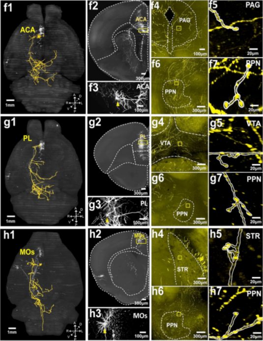 By applying dual-virus labeling and VISoR imaging, we clearly traced individual neuronal axons projecting from cortical regions such as the ACA and prelimbic area (PL) to the PPN, revealing distinctive collateral branching patterns. These findings offer a new perspective for understanding the neural circuit mechanisms by which the PPN participates in motor control, sleep, and related functions.