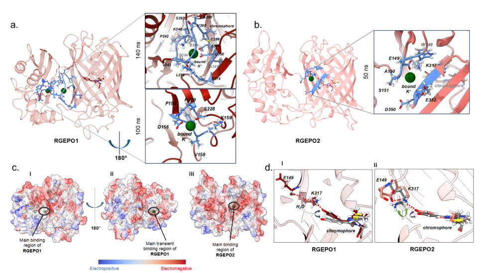 Molecular dynamics simulations of RGEPO1 revealed the presence of two potassium-binding pockets — a primary binding site and a transient binding site. The primary pocket comprises 13 amino acid residues, including D294 and D350, which directly coordinate with K⁺, and R374, which stabilizes the ion through a hydrogen bond with D294 (Fig. 4a). A continuous electronegative surface extends from the primary to the transient binding site, favoring the attraction and prolonged retention of positively charged ions (Fig. 4c).