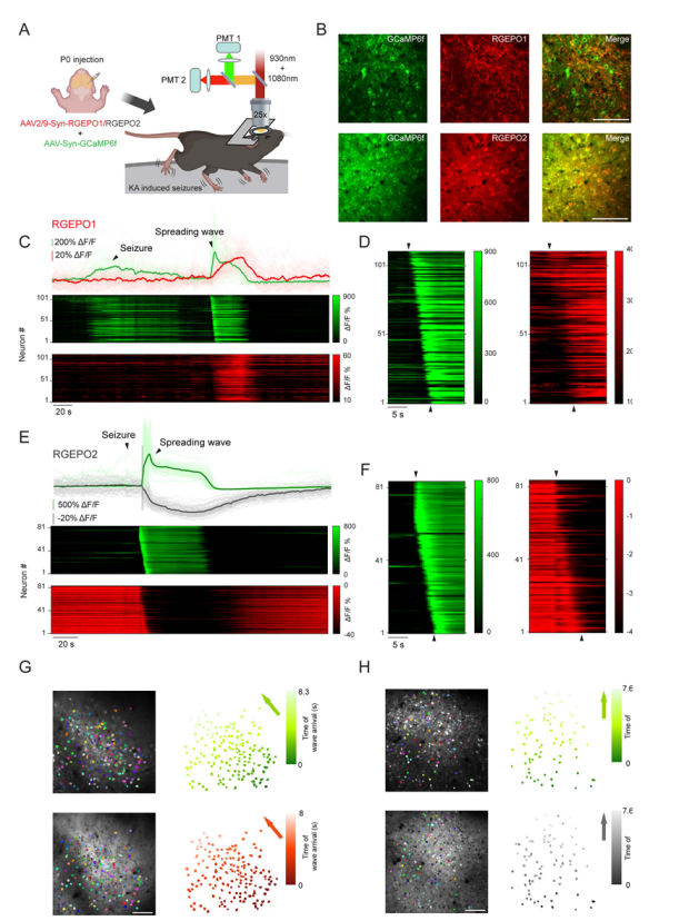 Figure 7. Two-photon imaging of GCaMP6f and RGEPOs in the kainic acid–induced mouse epilepsy model.