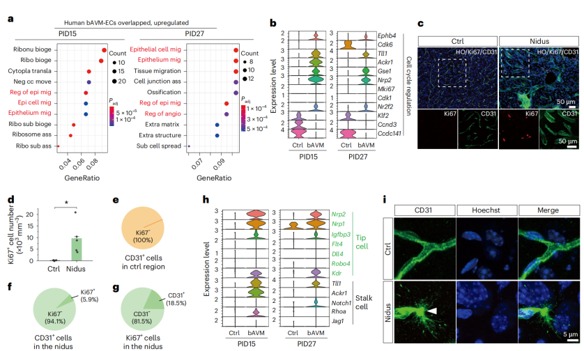 Gene Ontology (GO) enrichment analysis demonstrated that genes upregulated in both Braf-bAVM mice and human patients were significantly enriched in angiogenesis and epithelial/endothelial cell migration processes (Fig. 7a). Moreover, proliferation-related genes (Mki67, Cdk1, Cdk6, Ccnd3, Gse1, and Nrp2) were markedly upregulated in endothelial cells within the lesions (Fig. 7b), and Ki67 staining confirmed a notable increase in proliferating cells in the affected regions (Fig. 7c–g). Both tip cell markers (Flt4, Dll4, Robo4, Kdr, Nrp2, and Nrp1) and stalk cell markers (Notch1, Jag1, and Rhoa) were upregulated (Fig. 7h–i), indicating the presence of a pathologically hyperactive angiogenic process driven by the BRAFV600E mutation.