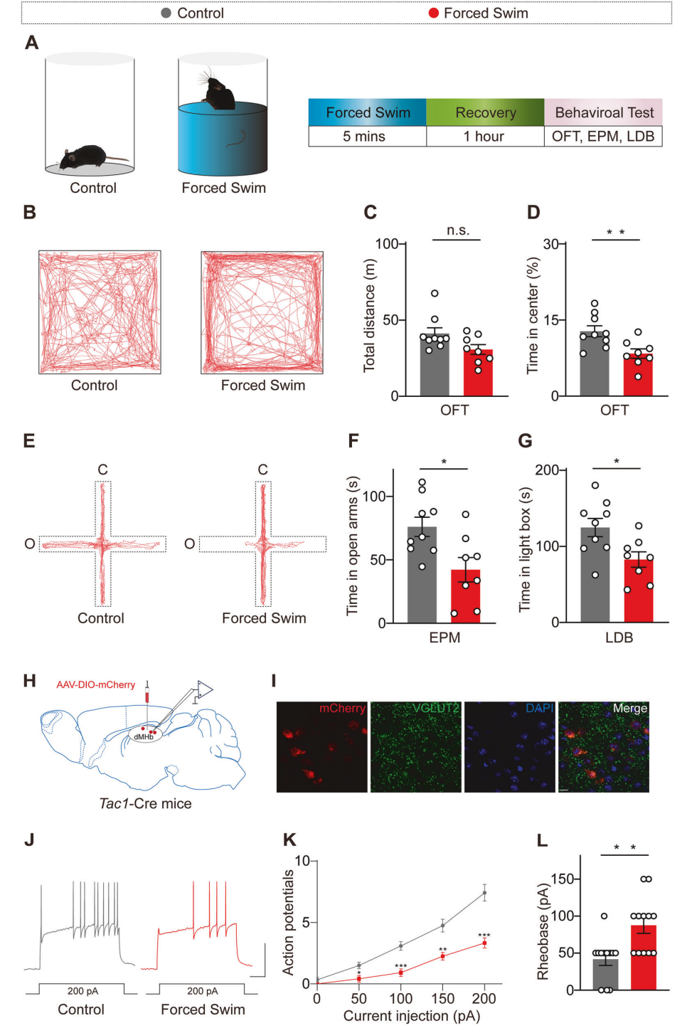 In the study, male C57BL/6J mice were subjected to a 5-minute forced swim test, followed by a 1-hour rest, and then tested in open field, elevated plus maze, and light-dark box paradigms. Results showed that stressed mice exhibited significantly increased anxiety-like behaviors compared with control mice.